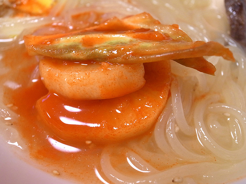 冷えていても十分に旨味が感じられ、甘さがいやらしくないギリギリのライン。ラーメンのスープで甘いのはあまり好きじゃないですが、冷麺のスープは甘くないとね。まぁ当然、後半別辛で激辛にしていく前提ですがw