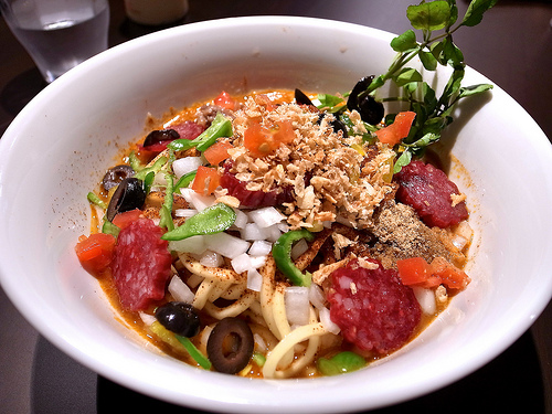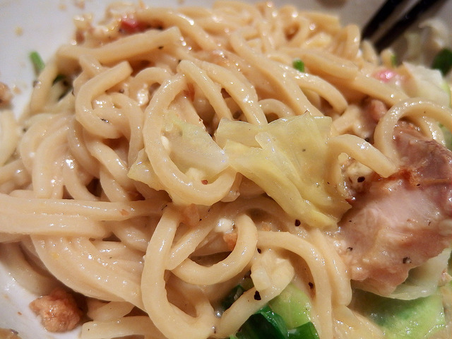 以前も書きましたが、ピザソバはアンチョビとかオリーブとかクレソンとかが入ってて、ジャンクな中にもどことなくシャレオツ感というか知性がありますが、これは完全にジャンク方向に振り切ったと言うか、もっと言うとバカやりきってる感じ(褒め言葉ですw)。