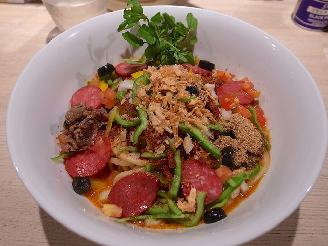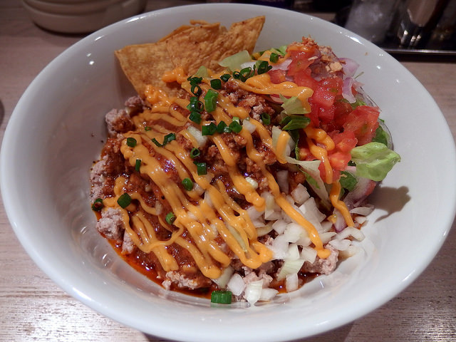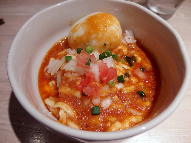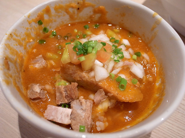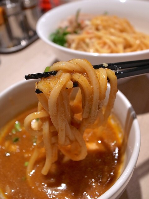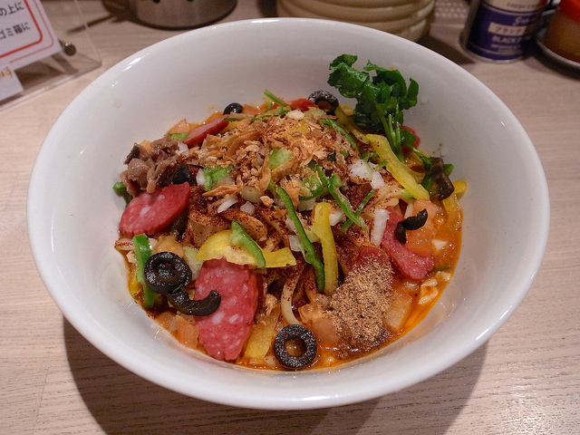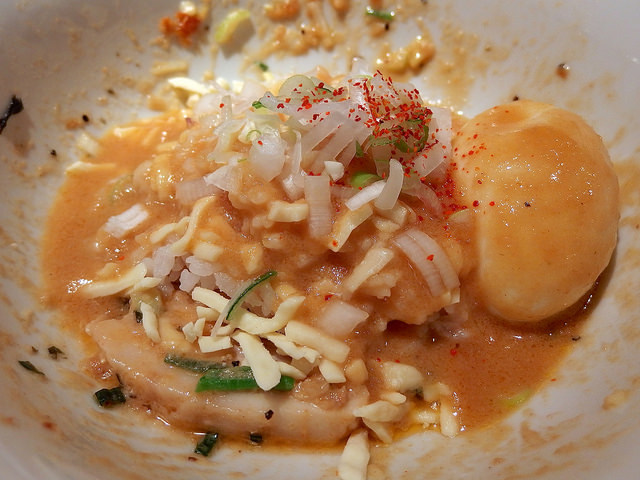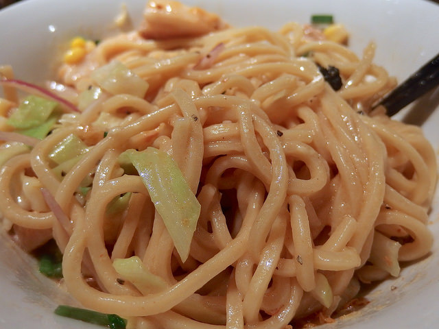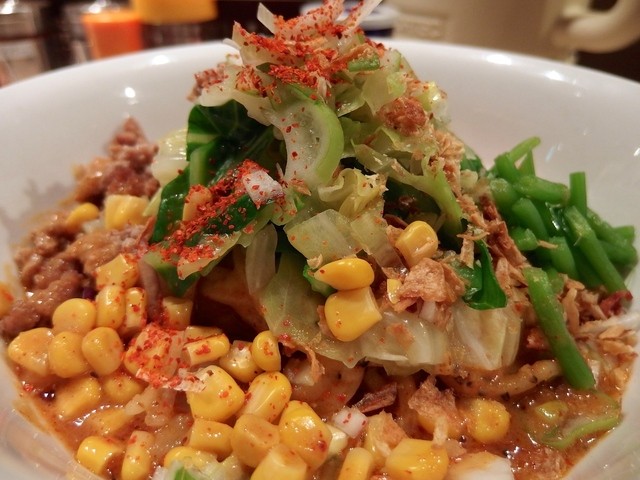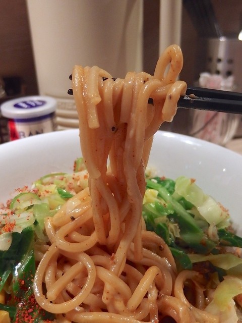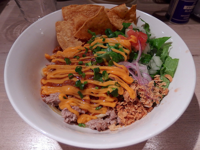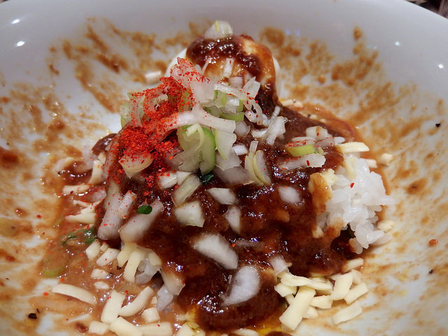 主にトマトソースとピザ用スパイスで組み立てられるピザソバに対し、こちらは味噌チーズソースとメキシカンスパイスで組み立てられる、ちょっとやんちゃなTexMex風味な一杯となります。
