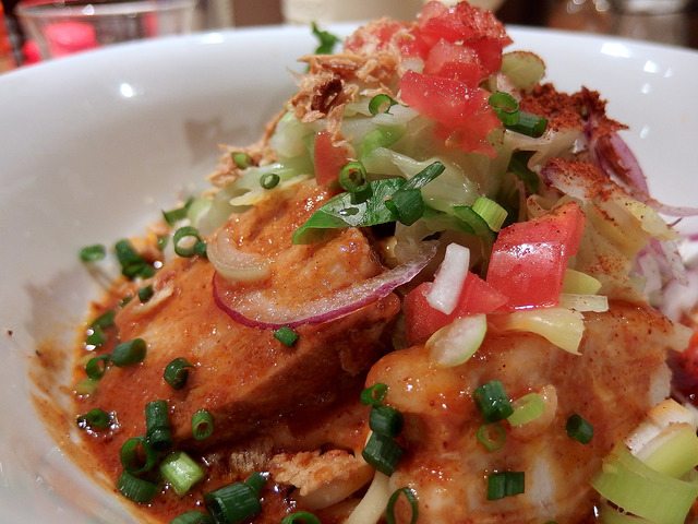 ソースはおそらく、ajito共通のベジソースに赤中心の味噌と香味野菜、メキシカンスパイス(ってなんでしょう?やっぱチリ主体?)等を加えたもの。