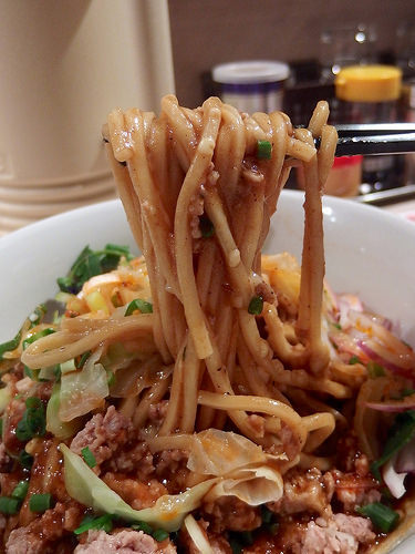 ソースで和えられた極太麺の上には、レタス、トマト、タマネギ、揚げネギ、トルティーヤ、ひき肉等が散りばめられており。その上からたっぷりかけられたチーズソースがまたジャンクな感じでテンション上がります。