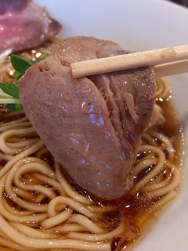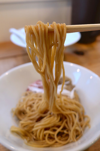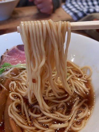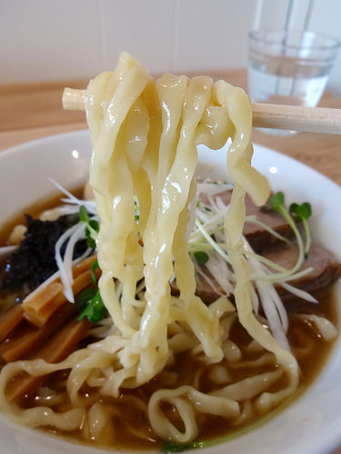 以前こちらで食べたのは、白河や喜多方ラーメンのような肉厚でムチプリな高加水の縮れ太麺でしたが、それとは対照的なスタイリッシュな麺ですね。