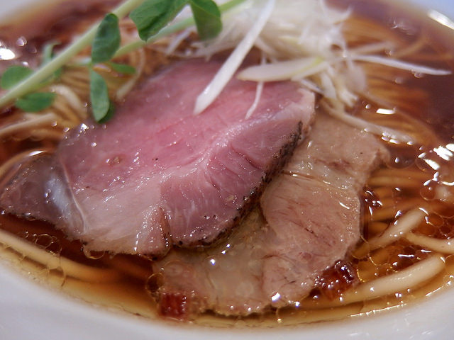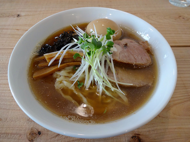 ちょっと濃い目の色の醤油スープの上にはラードの膜。トッピングはチャーシュー、メンマ、バラ海苔、AZS味玉、白髪ネギ、カイワレ。