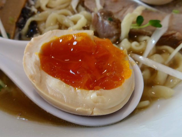 味玉は、割ればトローリと黄身が溢れる半熟仕様。黄身の旨味と調味液の風味のバランスがバッチリ。個人的にこれまで食べた味玉でベスト3には入るクオリティ。