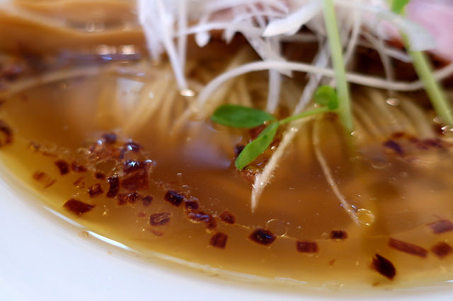 クリアなスープの表面には液体油と揚げネギ。上にはチャーシュー、メンマ、ネギ、豆苗、AZS味玉。