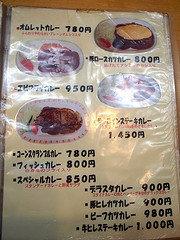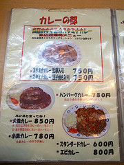いつもだとメニューも見ずに「焼きの中!(スタミナカレーの玉子焼きを中盛)」とコールするのですが、今日はスタミナの肉だけじゃなくハンバーグも食べたかったので(皆さん気づいてないかもだけど、この店の屋号「カレーとハンバーグの店」ですからね?w)、ハンバーグとスタミナ肉のハーフ&ハーフ(ただし玉子抜き)であるデラスタを中盛で。