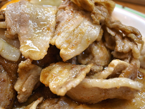 豚スタミナ焼きは、ちょい一味が効いたニンニク醤油で炒められた豚バラ。