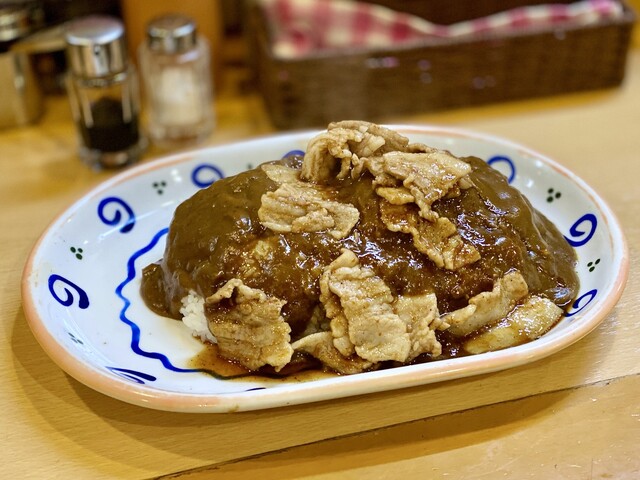 ご飯の上にハンバーグ、その上からルウがかけられ、炒めた豚肉が載せられたもの。パッと見ハンバーグの姿が見当たりませんが、ルウの下にあるんです。