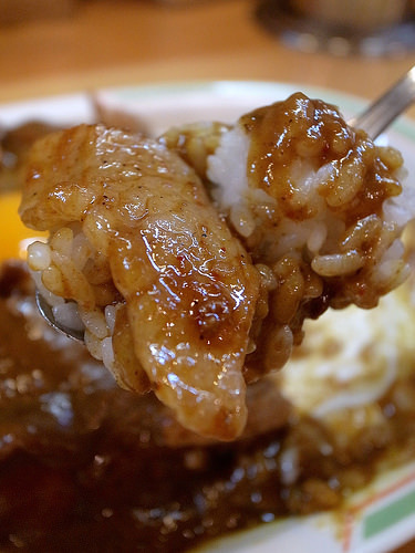 カレーの味も濃いので、食べ疲れしないよう肉はやや味付け控えめになってます(とは言っても十分白米のおかずとして成立するレベルの塩分濃度ですがw)。