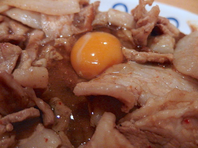 その上には豚生姜焼+生卵。