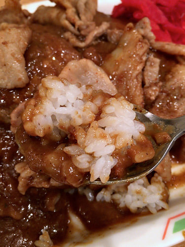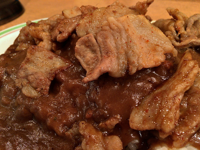 スタミナ肉は厚めのバラを生姜醤油ダレで炒めたもの。ドロリとしたルウと一緒に食べると。。。この背徳感たまらんねw