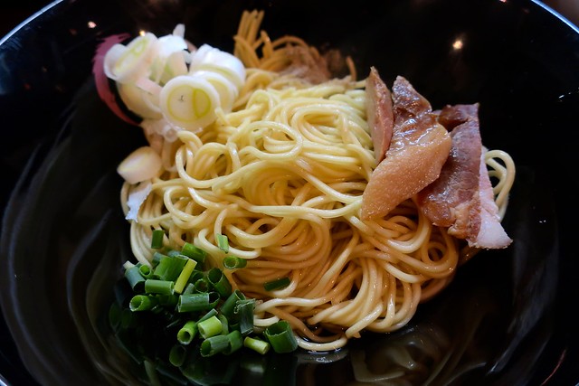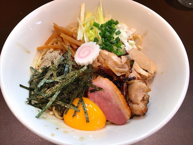 茹でた半玉の麺にタレ、油、煮干粉、チャーシューの歯切れ、ネギを載せた和え玉は、そのまま混ぜて食べてもよし、残ったスープでつけ麺のようにして食べてもよし、とオールマイティな楽しみ方ができます。