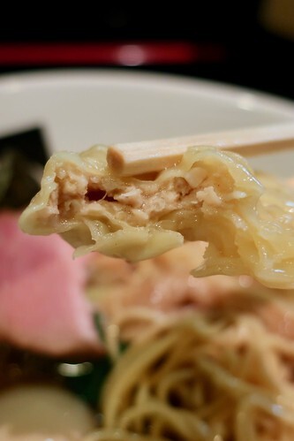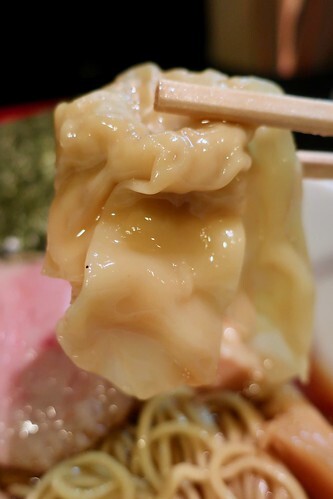 ワンタンは3つ。注文の都度、薄い皮で包まれ作られるワンタンには、真ん中にちょこんと餡が入ってるタイプ。