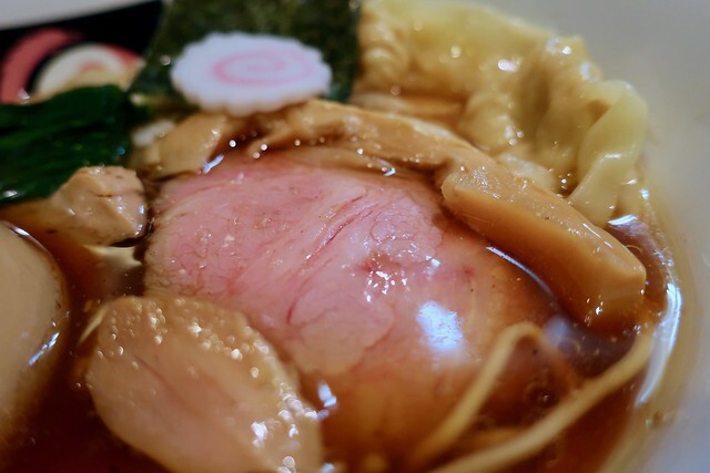 口が小さめで背が高い丼には、クリアな醤油スープ。その上にはチャーシュー、メンマ、青菜、海苔、ナルト、ワンタン、AZS味玉が所狭しと並びます。