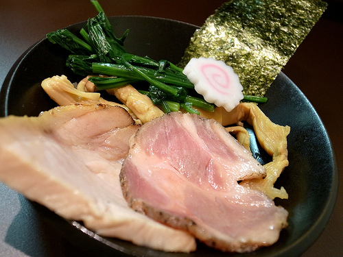 チャーシューはややピンク色の低温調理ロース煮豚と、味濃いめに煮た鶏チャー。