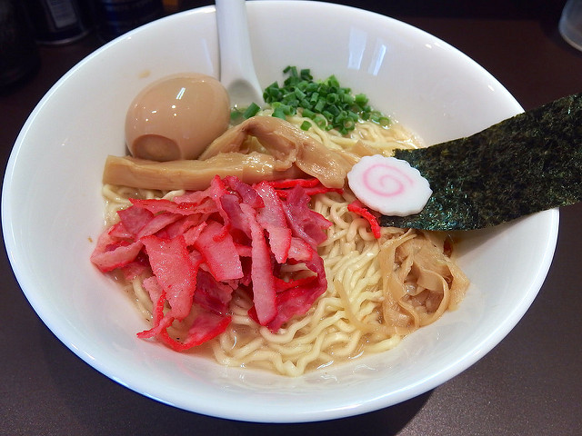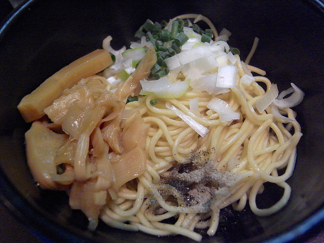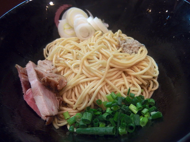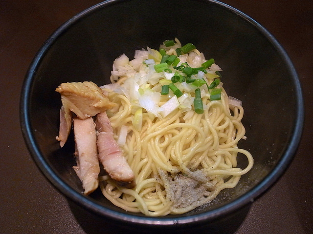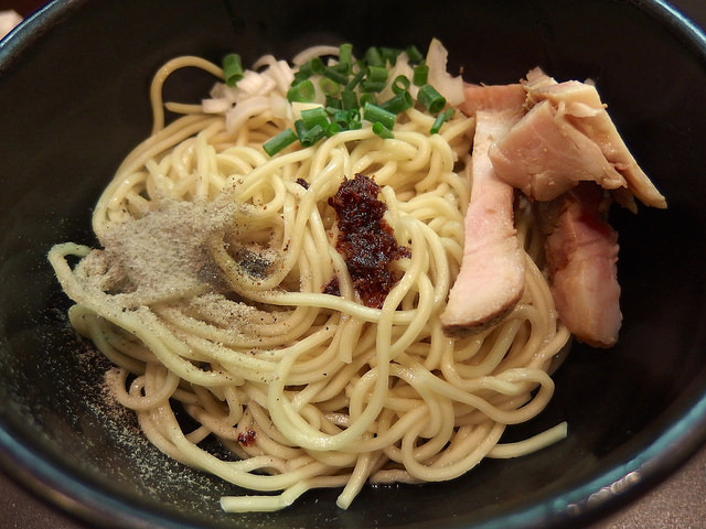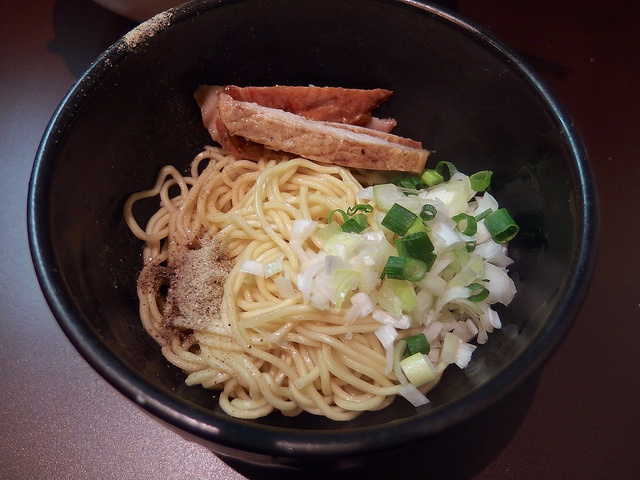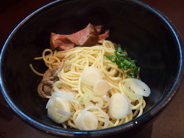 最近出すお店も増えてきましたが、和え玉は、麺をタレと油で和え、チャーシューの端切れとネギ、煮干し粉を載せたもの。
