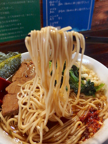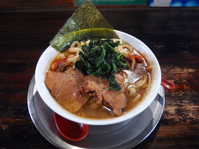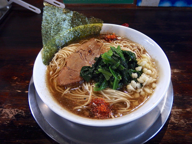 濃い目の醤油スープからワイルドな極太麺がうねりながら頭を出しており、上にはチャーシュー、青菜、海苔、魚粉、一味、ニンニク、ショウガ。