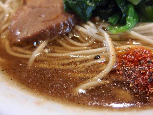 濃い茶濁スープの上には厚めのラード層、そして魚粉や一味、ニンニクや生姜がたっぷり。