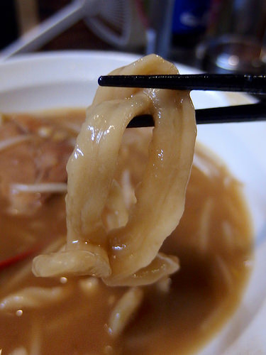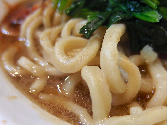 極太の麺は太さが均一ではなく、かつ手揉みにより縮れており、ゴワゴワ・ブルブル・モチモチが入り混じった独特の食感。