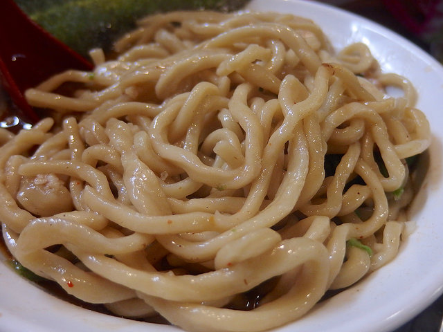 かなり強めに手もみしてから茹でているようで、麺同士がくっついていたりボロボロにちぎれていたり、もう箸でキレイにリフトすることが不可能なレベルwただその突き抜け感が(・∀・)イイ!!