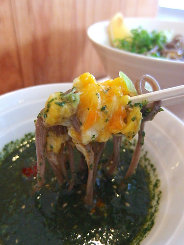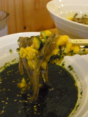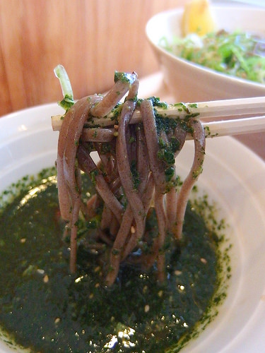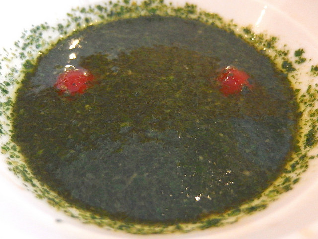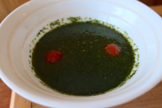 バジル+蕎麦というと、「変わりそば」として蕎麦にバジルを練り込むアプローチはこれまでもあったと思うけれど、つけ汁側にたっぷりバジルを投入するというこの組み合わせは初めての味わいです。素晴らしい!