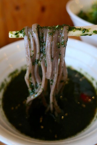 蕎麦汁っぽさよりバジル汁っぽさの方が強いので、いわゆる日本蕎麦の延長にある変わりそば(蕎麦に何かを練り込んだもの)とは全く異なる、蕎麦とは全く違う麺料理になっている感あります。ミニトマトの酸味もより清涼感をアップさせてくれますね。