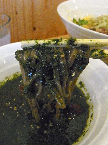 ベースはかなり甘みの強い辛汁ですが、表面にたっぷりと生バジルのペースト入りのオイルを貼っており、一口口に含めはブワッとフレッシュなバジルの香りが口に広がります。