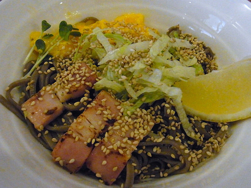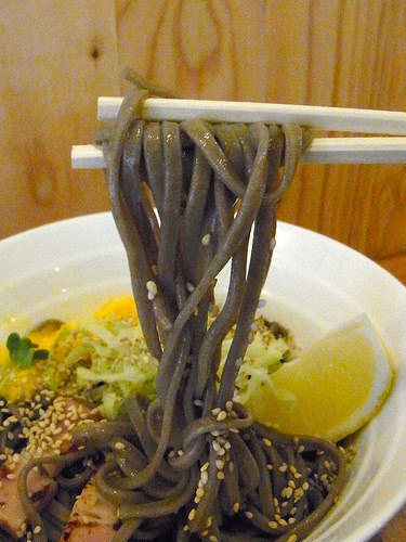 キンキンに〆られた極太そばの上には、スクランブルエッグ、レタス、ベーコン、レモン、カイワレ、白ごま。そばとしてはかなりぶっ飛んでますよねw