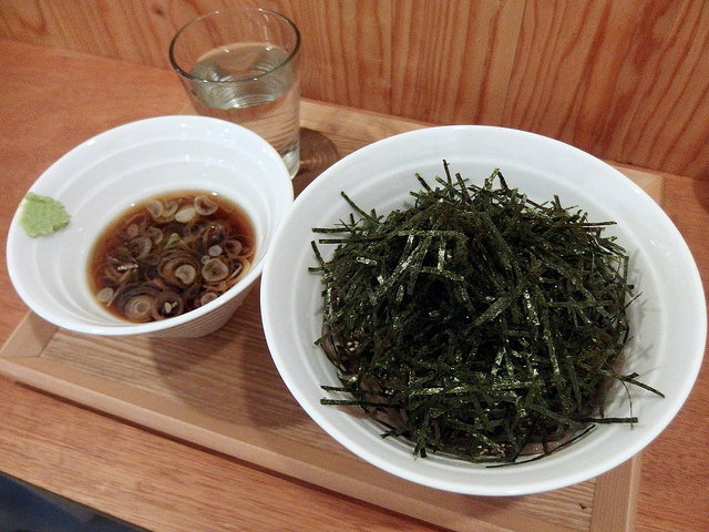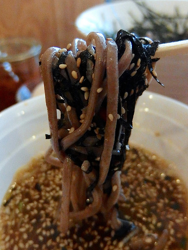 深めの丼には、黒くて太い蕎麦。その上にはたっぷりの刻み海苔と白ゴマ。