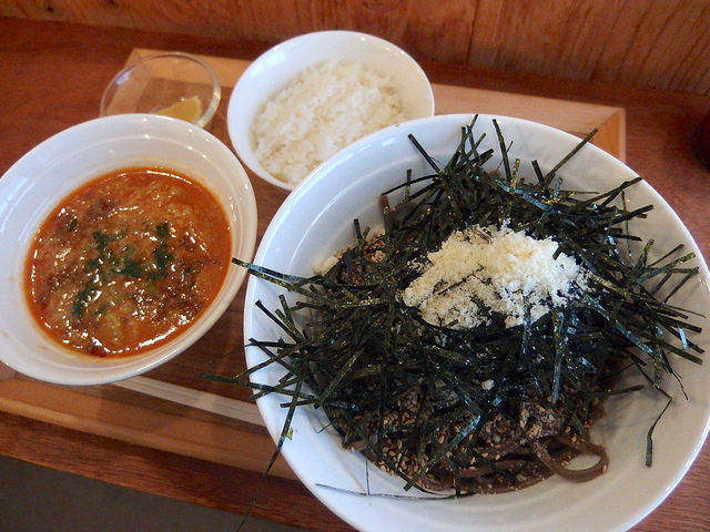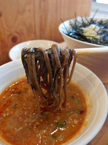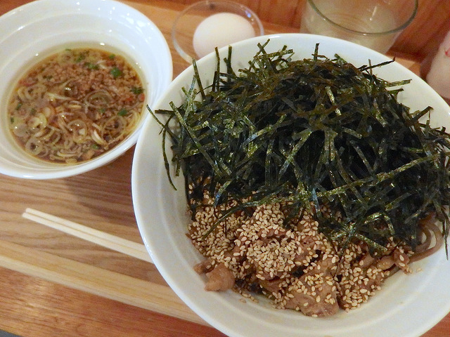 つけ汁のベースはかなり甘めの辛汁で、台湾ミンチ的な甘辛牛そぼろ(鷹の爪とニンニク、醤油で炒めたもの)と液体脂が加わることによりさらにコクがアップ。そばを超越した、つけ麺よりの食べ物になってます。