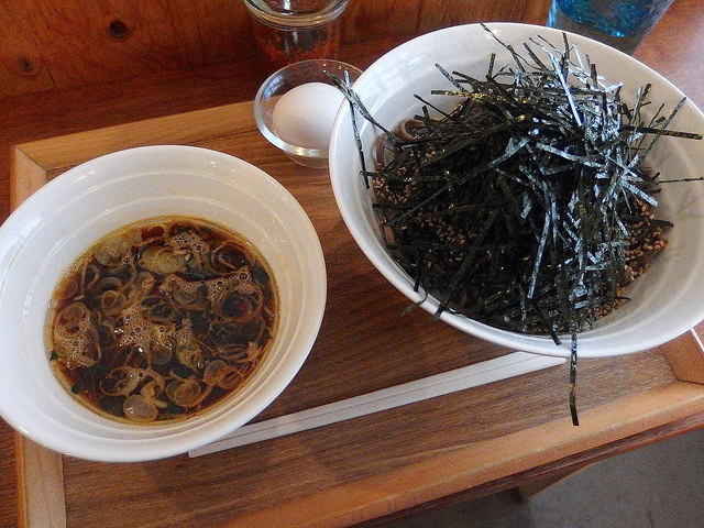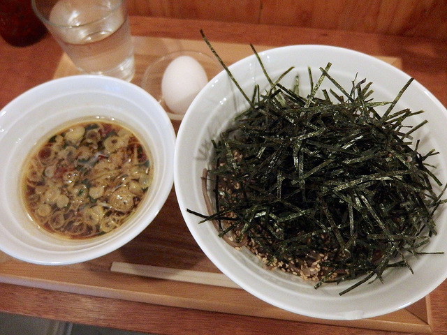 ちなみに港屋系のお店では、汁側に玉子を入れるのが推奨されることが多いですが、個人的にはそれをやるとつけ汁の味が白身で薄まっちゃうのであまり好きじゃないんですよね。