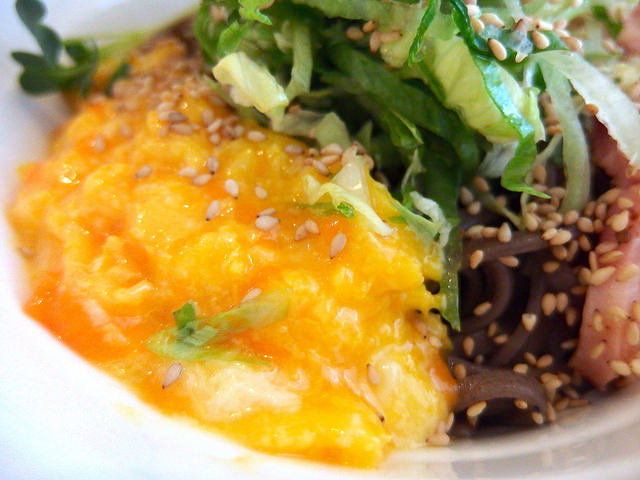 途中から、そばと半熟スクランブルエッグ、レタス、ベーコンも混ぜて食べ進みましょう。