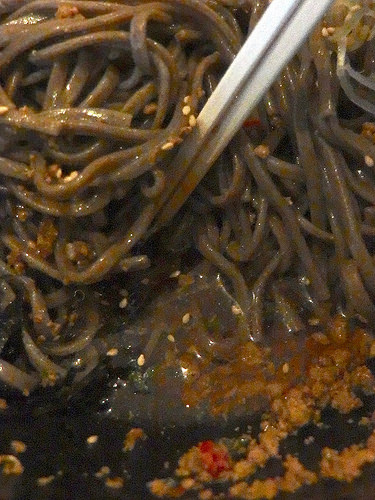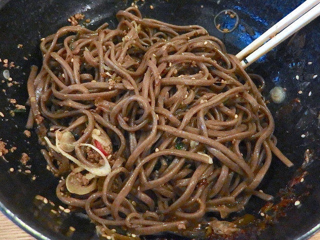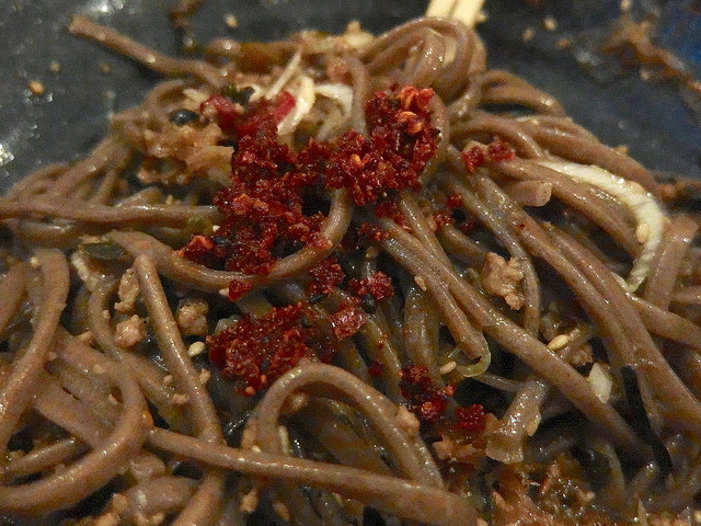 全体の味わいとしては、乱暴にまとめると「ピリ辛ニンニク醤油挽肉和え蕎麦」って感じかな?