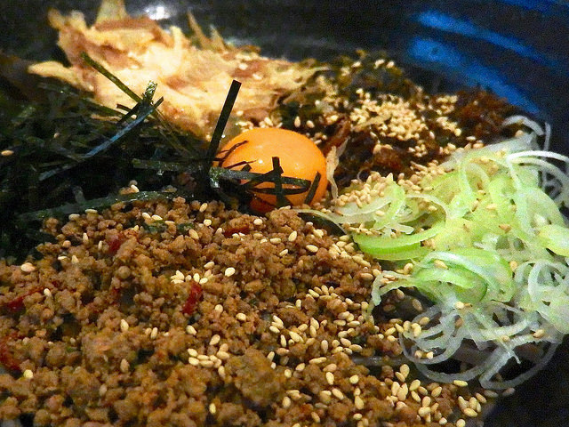 トッピングの陣容は、ガパオ風ひき肉、高菜、花鰹、刻み海苔、白ネギ、中心にS玉の卵黄。