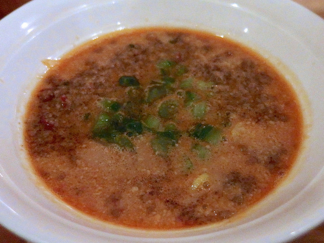 そしてその表面には、ひき肉、鷹の爪、青ネギ(バジルかと思ったけど違うっぽい)が浮いており、本家とはちょっと変わった雰囲気。