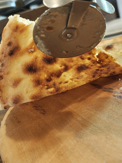 手際良く焼き上げられたパリッとタイプのピザ、裏面もしっかりヒョウ柄。