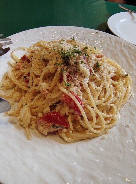 私は彩り野菜と自家製スモークサーモンのカルボナーラにしました。
