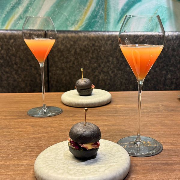 Moderatoコースをいただきました。まずは竹炭バンズのミニバーガーからスタート。美崎牛のローストビーフと紫キャベツ、ルーッコラやセルバチコがサンドされ、トンナートソースのまったり感が絶妙です。