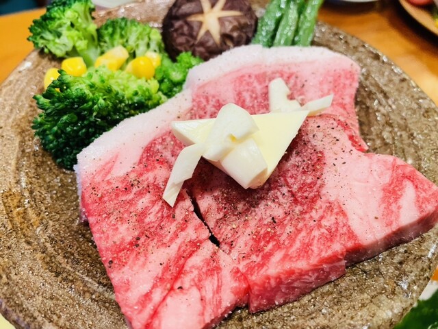 牛陶板焼き、お肉が柔らかくて美味です。海産物だけでなくお肉も美味しいんですね。