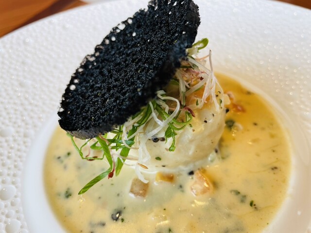 ウェルカムドリンクに続き、シェフからご挨拶の一品ということで"サラダグルマンディ“(美食家のサラダ)という10種類以上の季節の食材を使用したサラダが出されます。プレートだけでなく食材の盛り付け方がとても芸術的!!サラダグルマンディで食の旅がスタートします(*⁰▿⁰*)