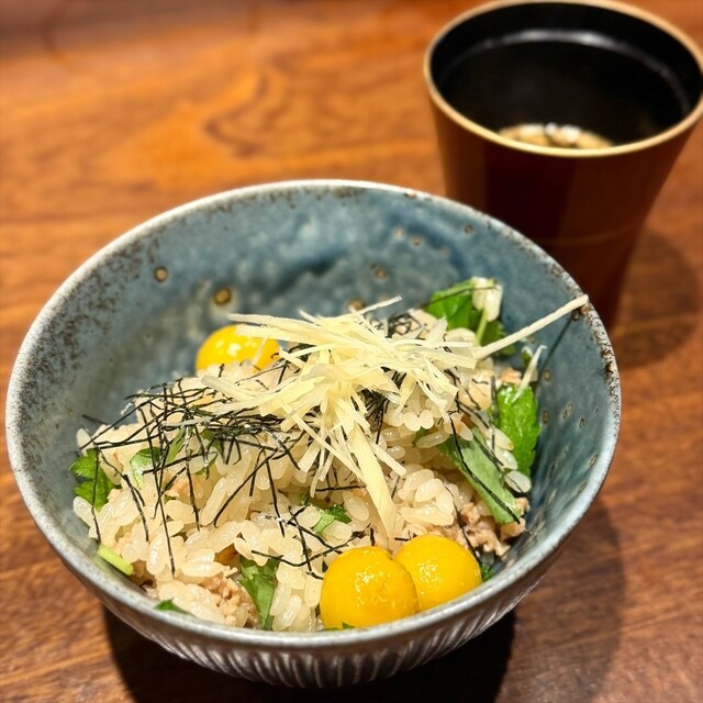 〆は甘辛そぼろの炊き込みご飯。