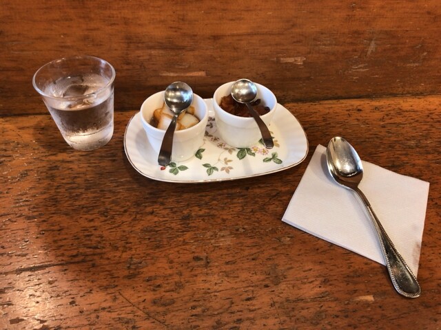 まずは薬味(福神漬けと玉ねぎのピクルス)が陶器の器で提供され、