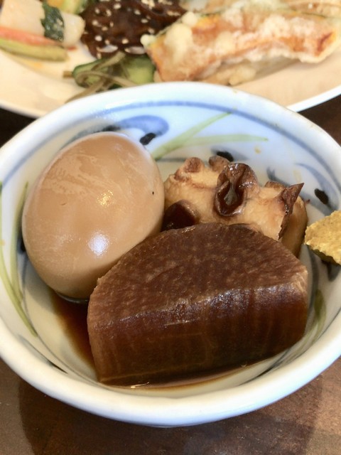 ・おでん(大根、卵、ちくわ、こんにゃく、厚揚げ)、辛子