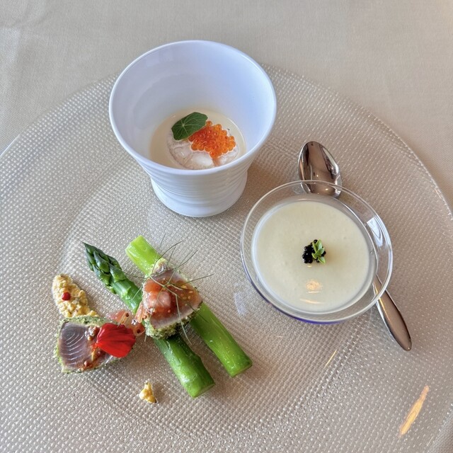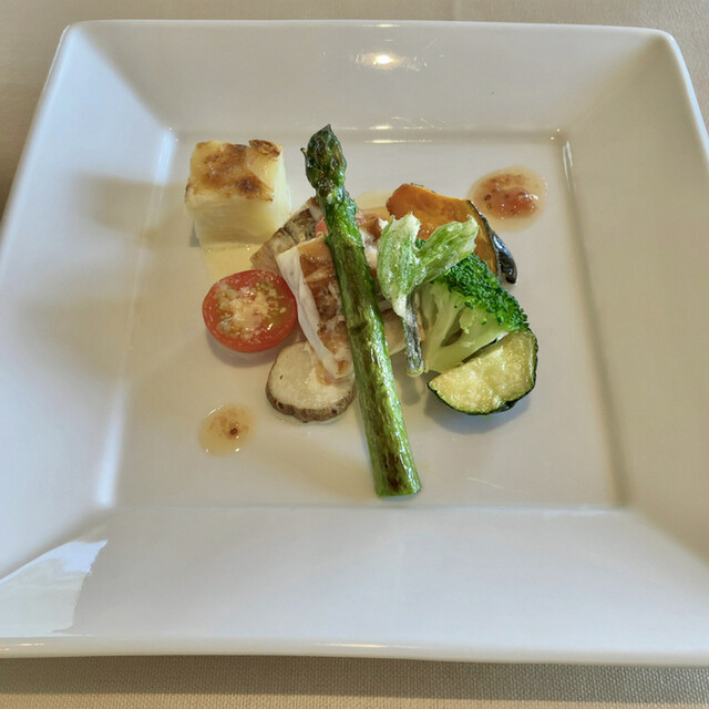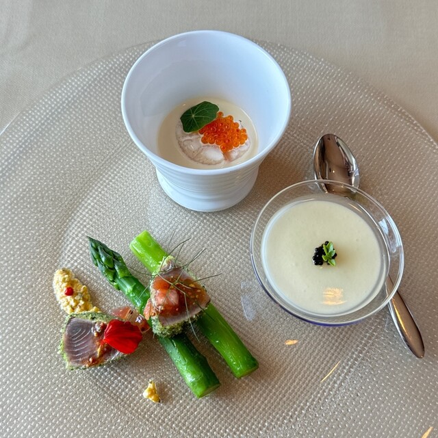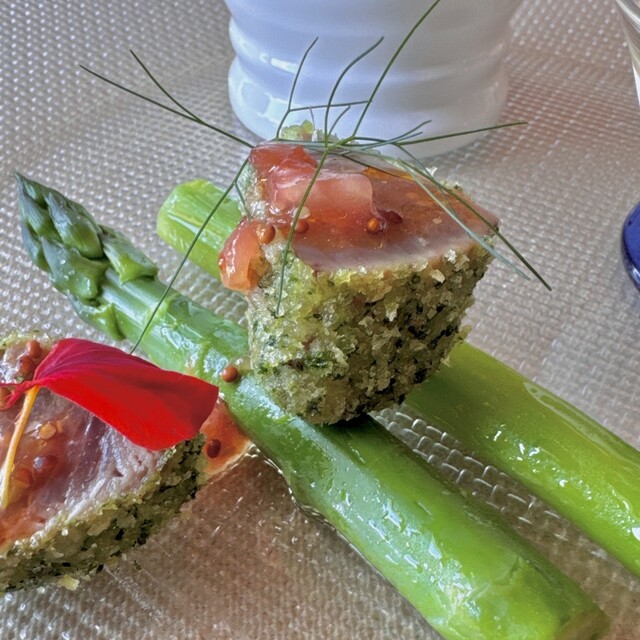 お昼のフルコース(\4,800) 季節のお任せオードブル:高知産鰹の香草パン粉焼き・中山のアスパラ