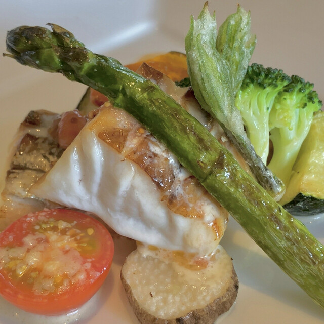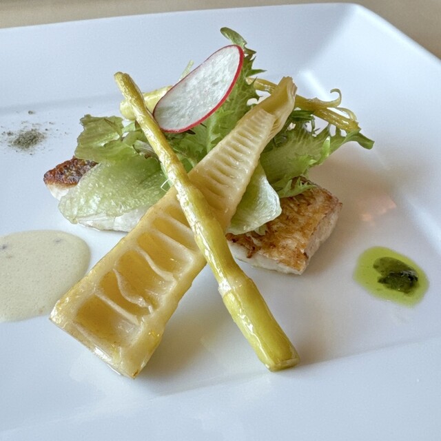 お昼のフルコース(\4,800) 本日のお魚料理:沼津産イトヨリダイのポアレ 破竹・根曲がり筍