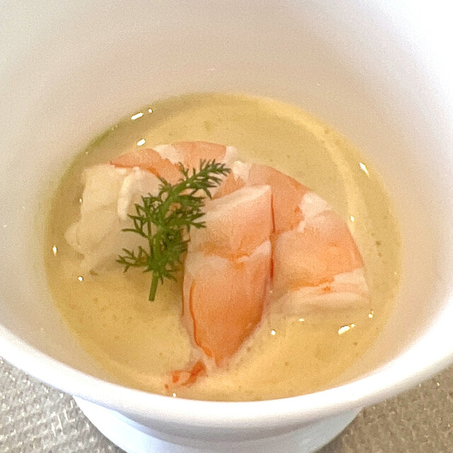プチコース(\3,300) 季節のお任せオードブル(青菜のフラン・天使の海老)