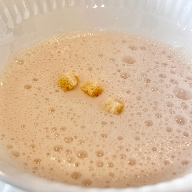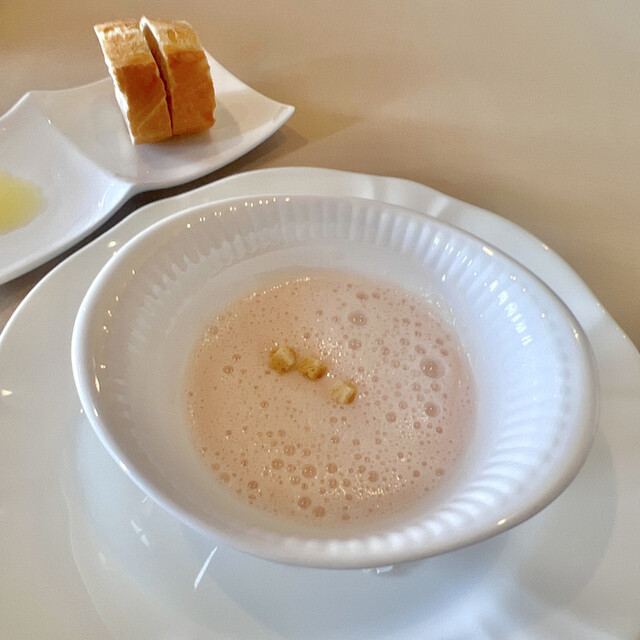 プチコース(\3,300) 特製スープ(キクイモと洗馬・青柳農園のピンク色のジャガイモ)