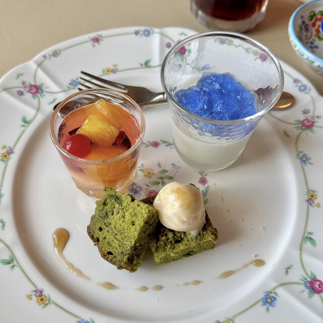 お昼のフルコース(\4,800) 季節の手作りデザート:ミルクプリン、バタフライピーのジュレ