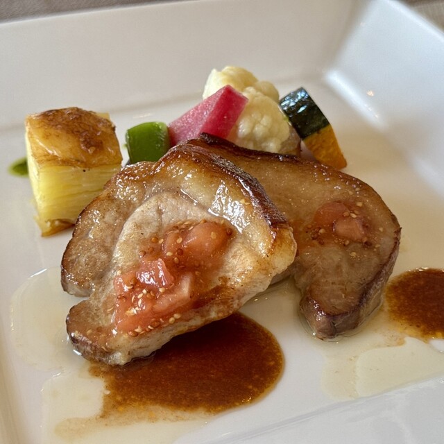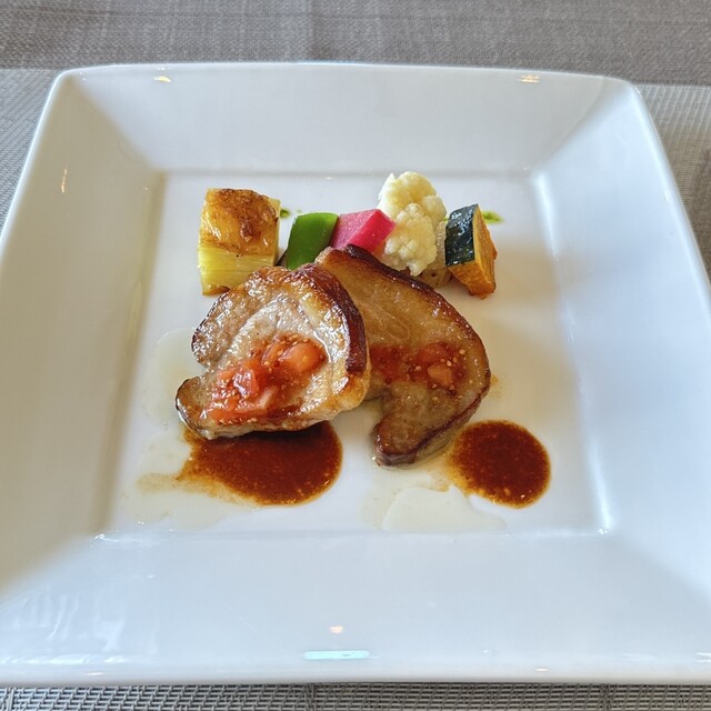 ランチ・プチコース(\3,500) 吟醸豚スモークのロースト、赤ワインのソース