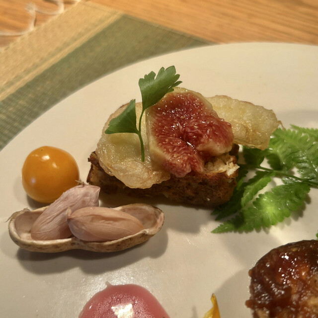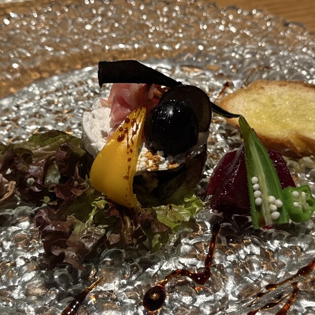 旬野菜の野々庵コース(¥6,600) 生ハム、なすとカッテージチーズ カリカリのバゲットにのせて